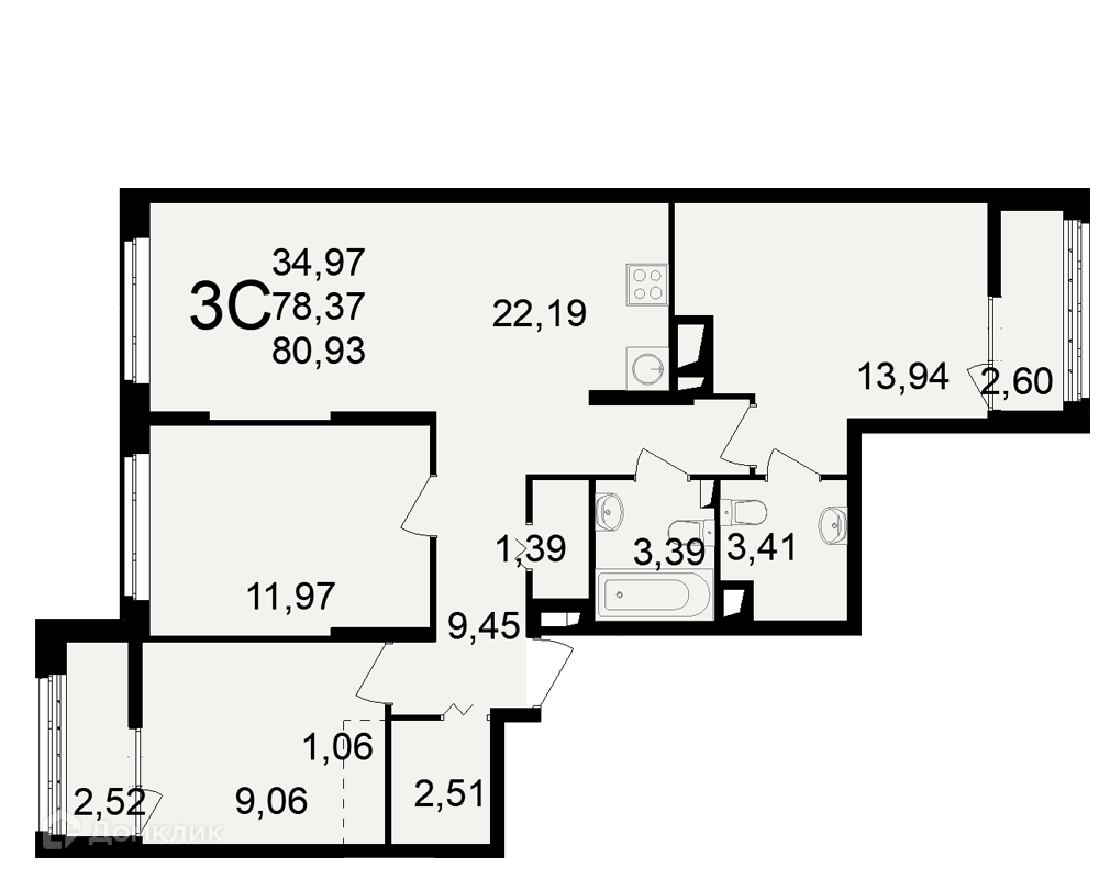 Планировка 3 комн. в ЖК"Новое измерение"