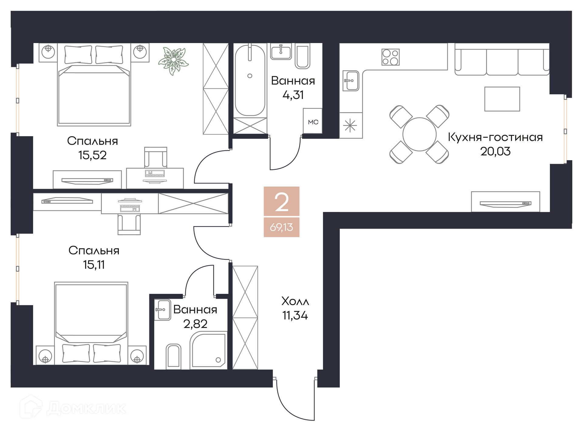 - Общая площадь: 69.13 м²