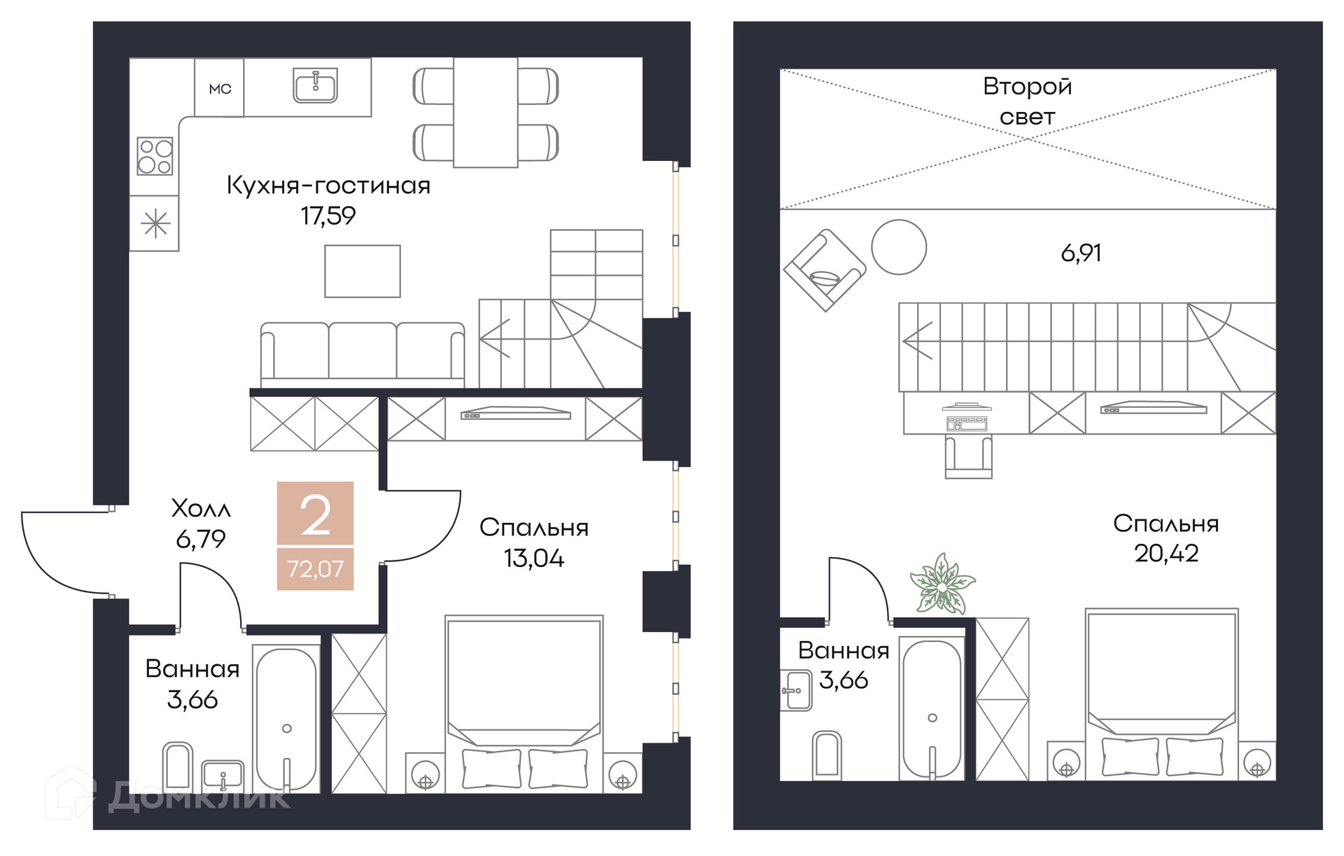 - ✅ Кухня: 17.59 м² — эргономичное пространство.