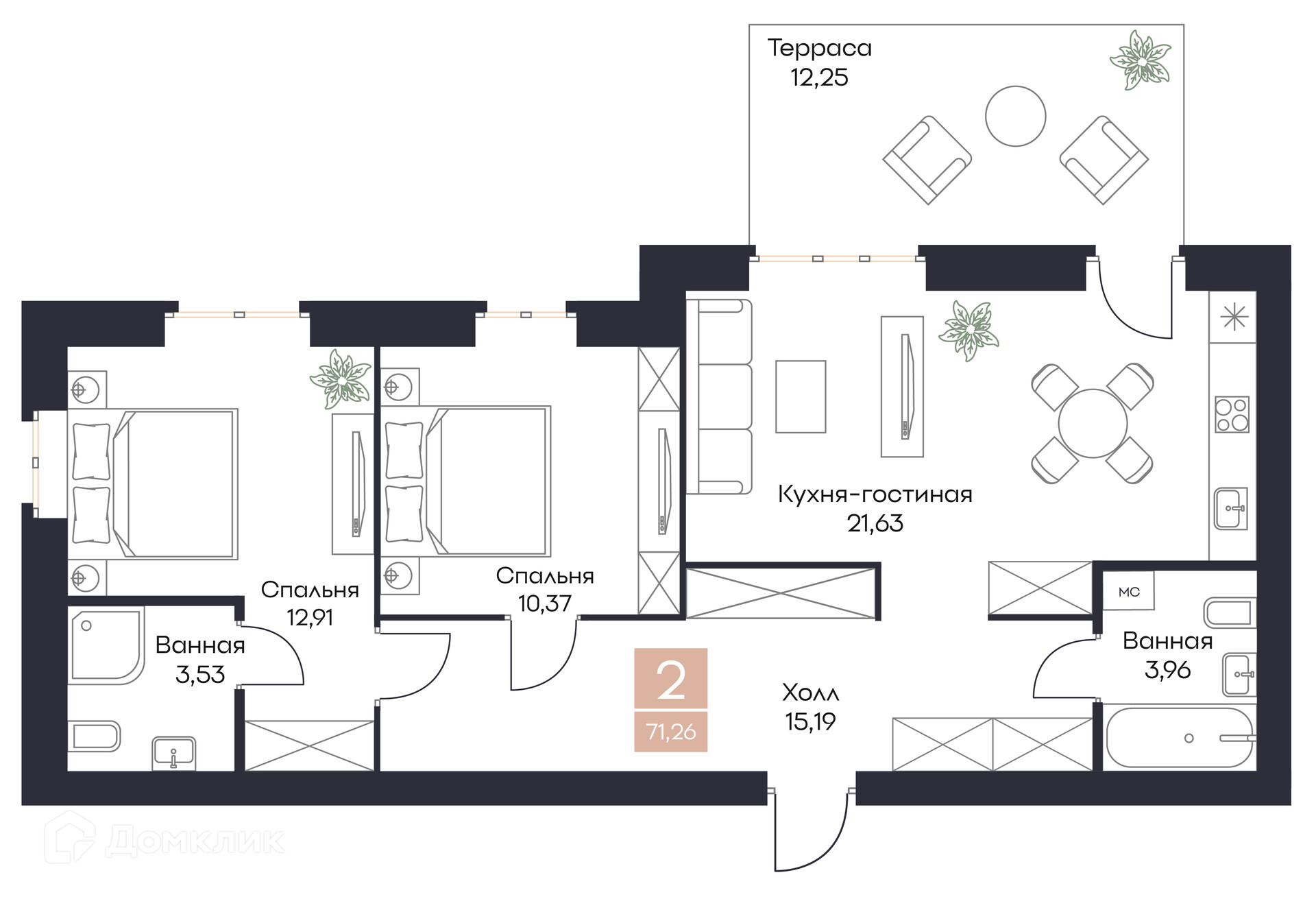 - Общая площадь: 71.27 м²