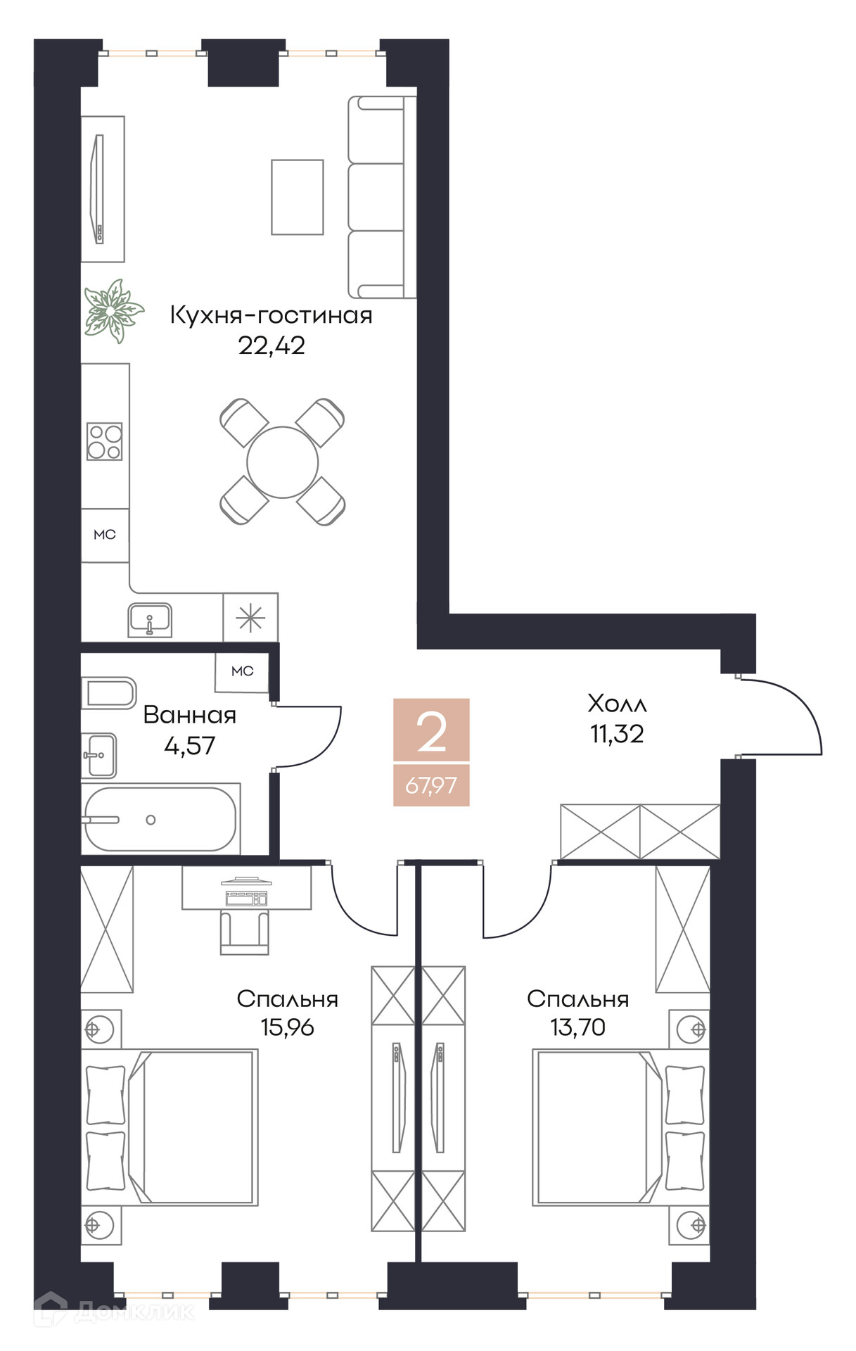 - ✅ Кухня: 22.42 м² — идеальна для семейных ужинов.