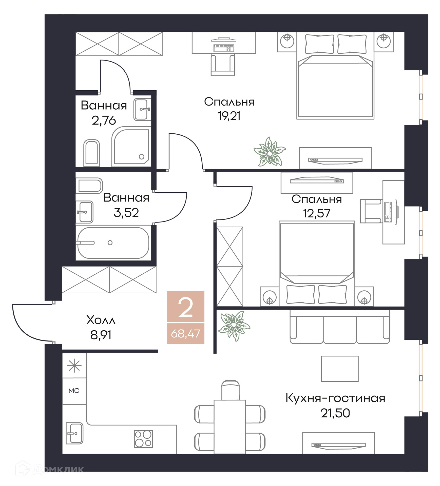 - ✅ Кухня: 21.5 м² — идеальна для семейных ужинов.