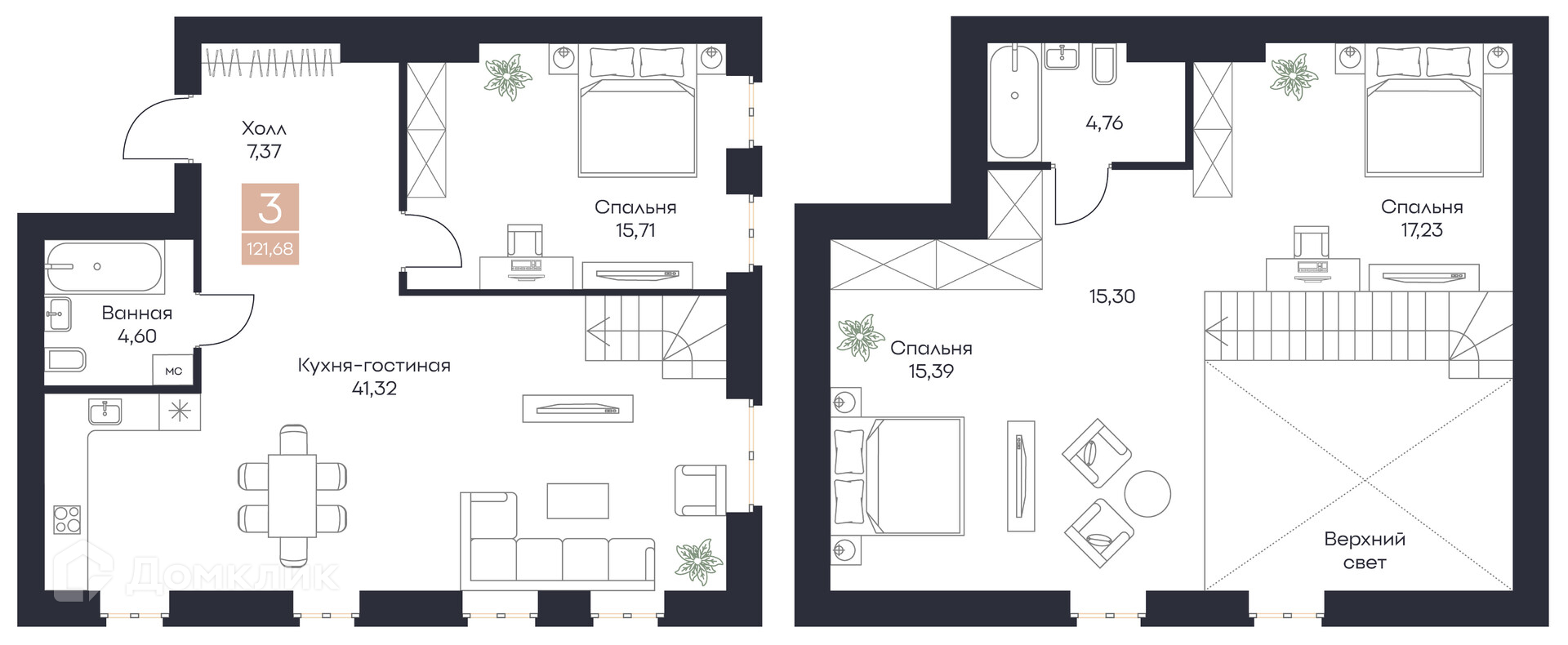 - Общая площадь: 121.68 м²