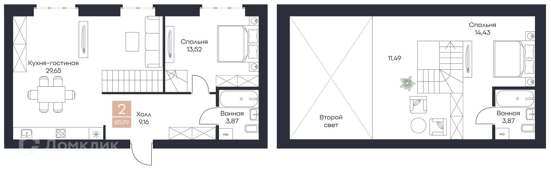 - ✅ Кухня: 29.65 м² — эргономичное пространство.