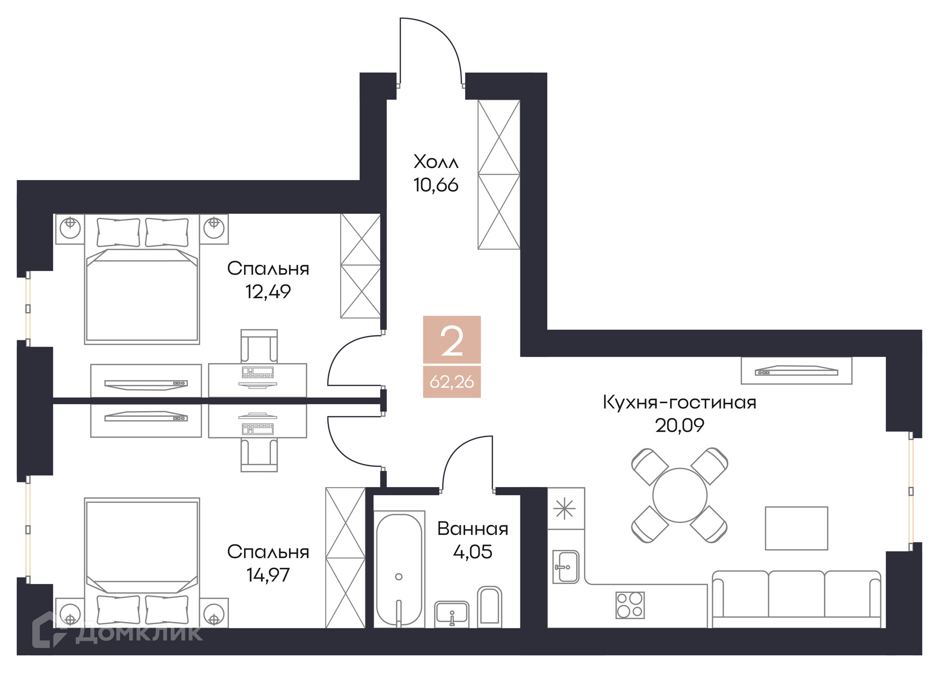 - Общая площадь: 62.26 м²