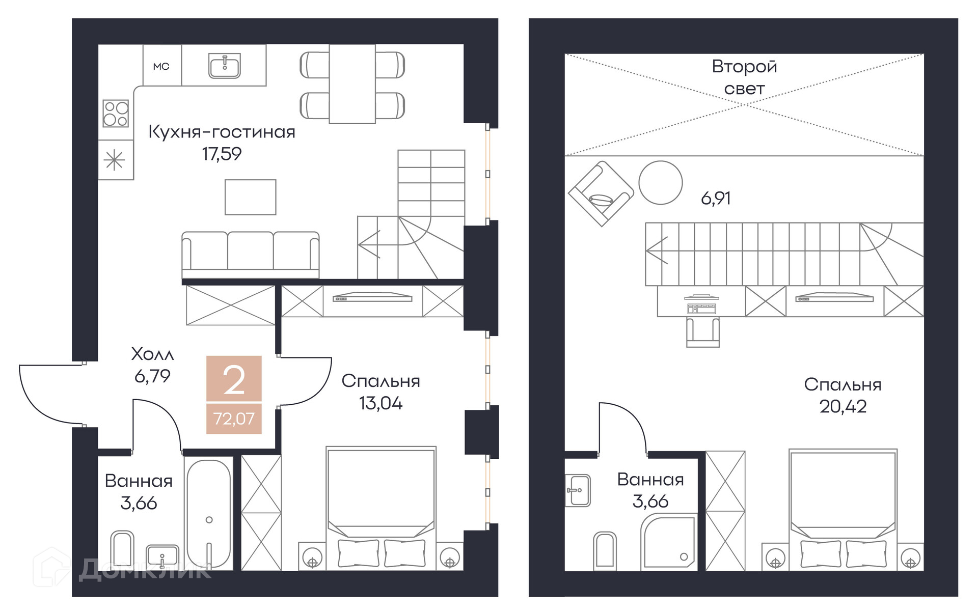- ✅ Кухня: 17.59 м² — эргономичное пространство.