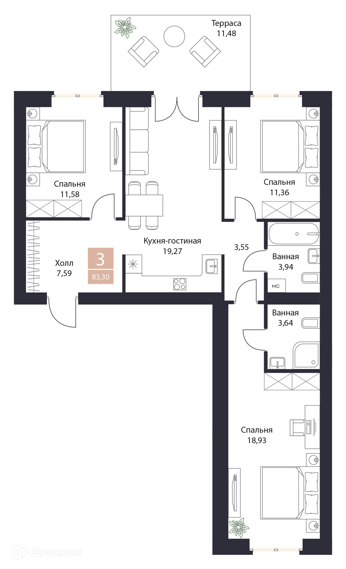 - ✅ Кухня: 19.27 м² — эргономичное пространство.