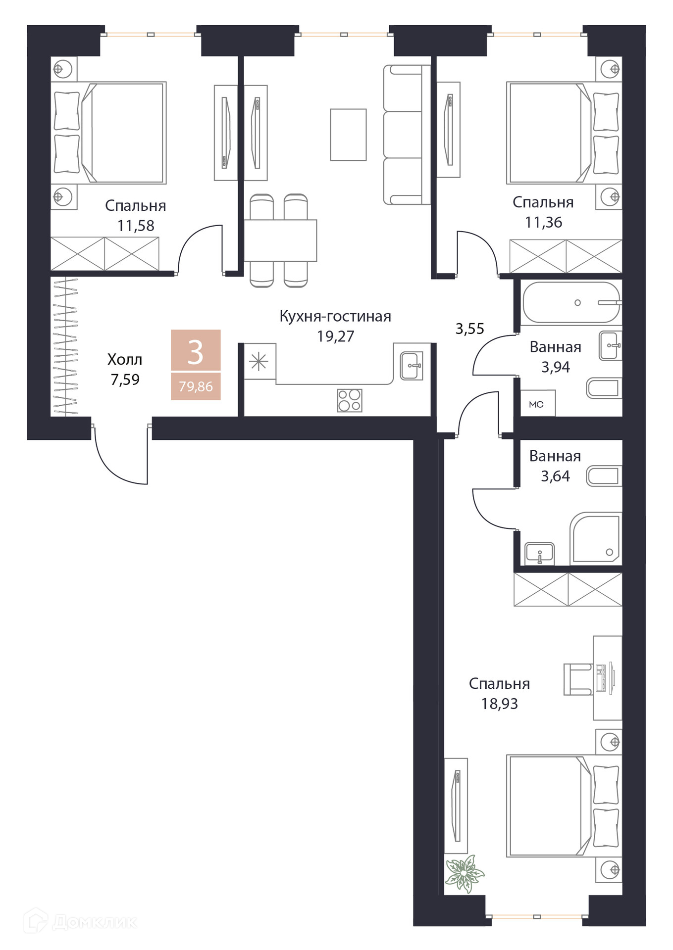 - ✅ Кухня: 19.27 м² — эргономичное пространство.