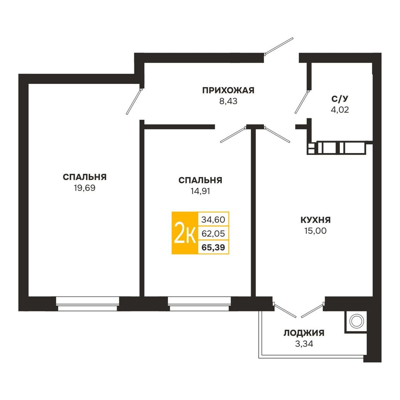- ✅ Светлая жилая площадь: 34.6 м².
