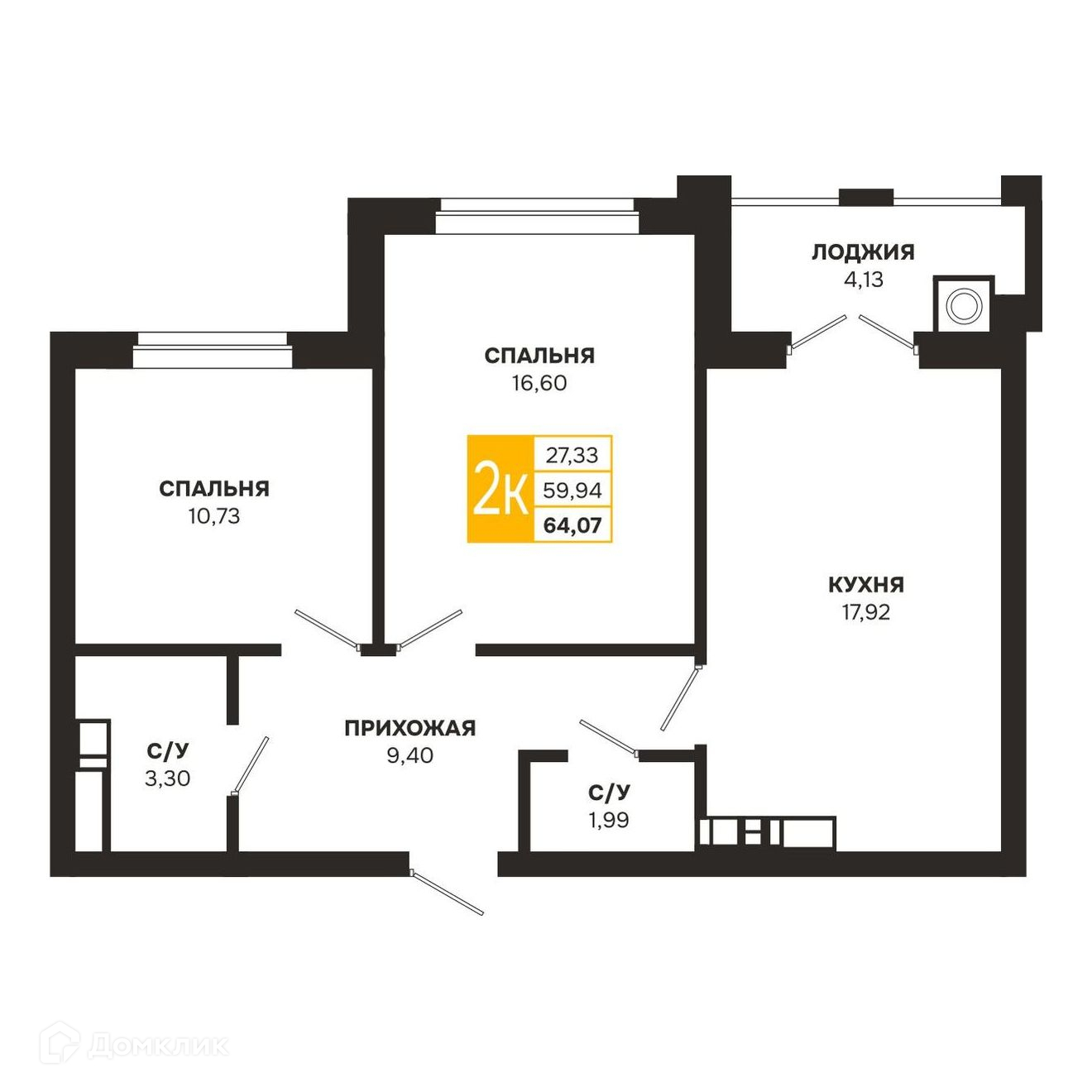 - Общая площадь: 64.07 м²