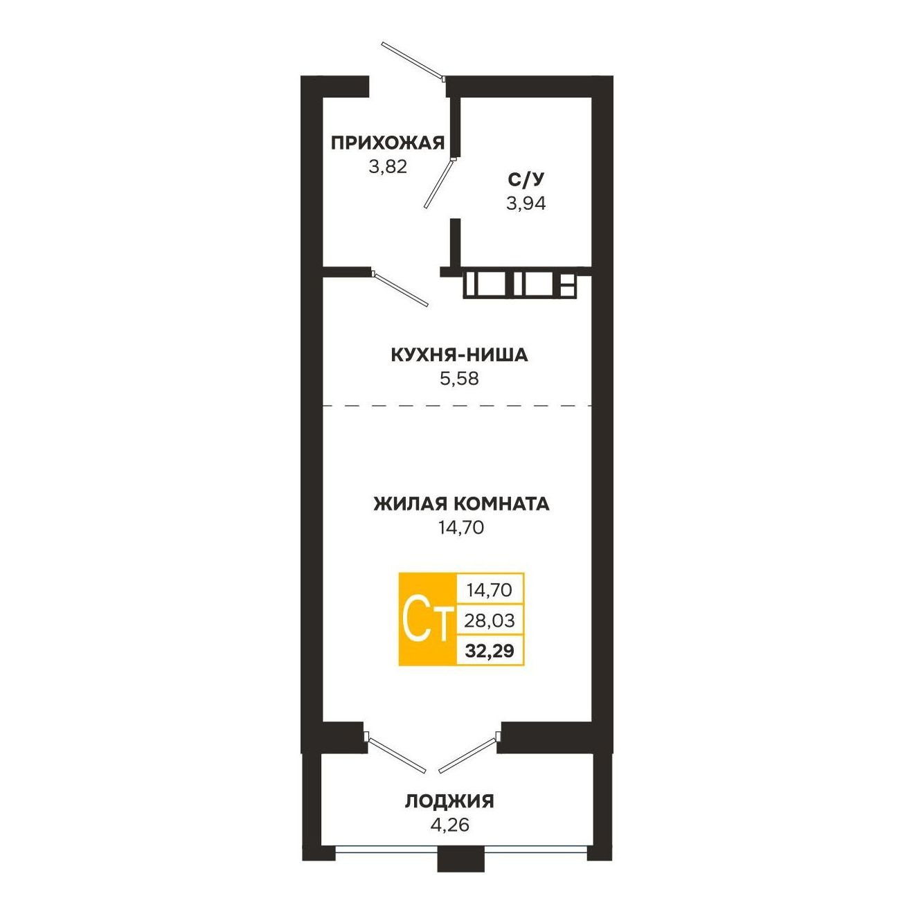- Общая площадь: 32.29 м²