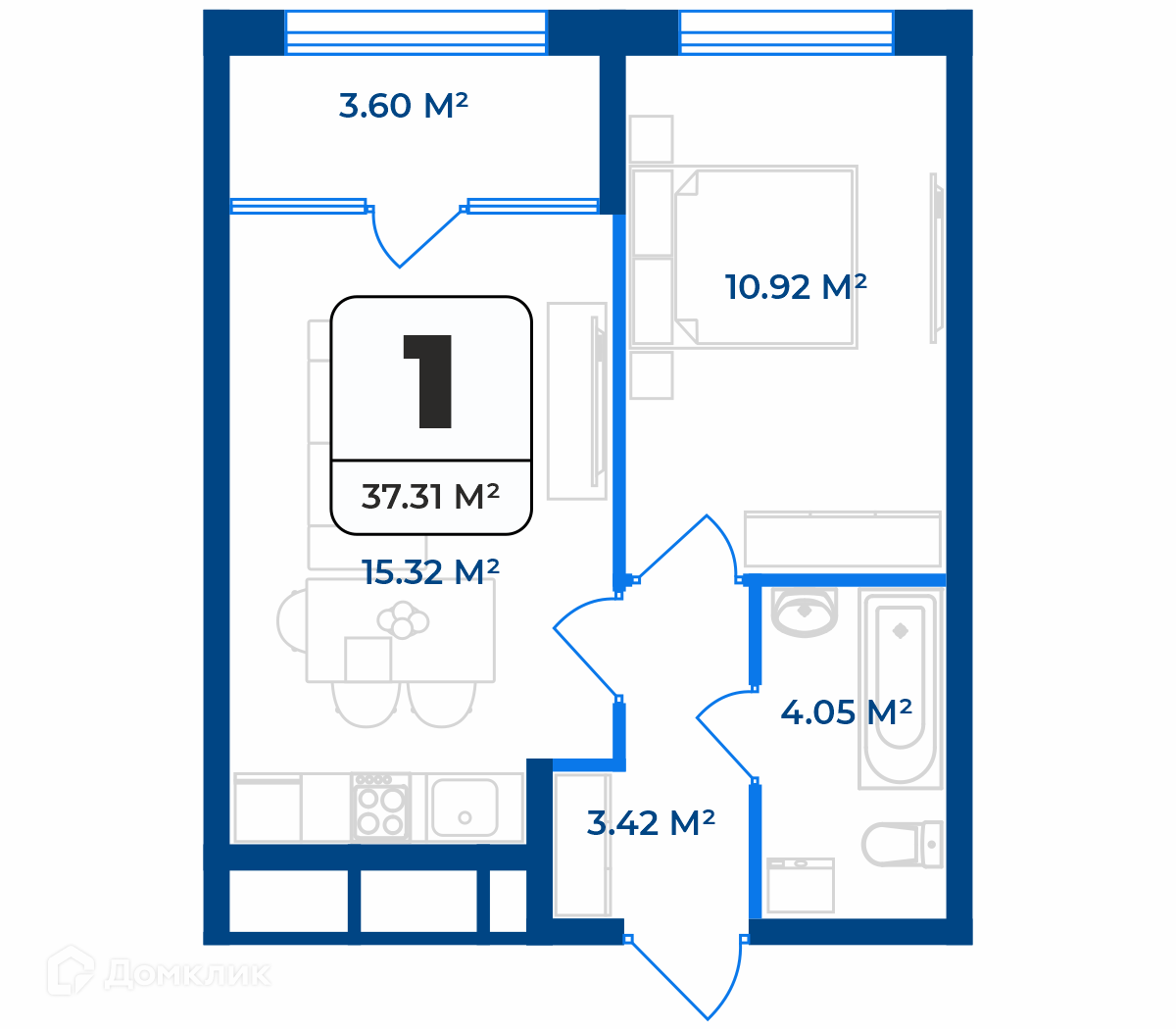 - ✅ Просторная жилая площадь: 33.71 м².