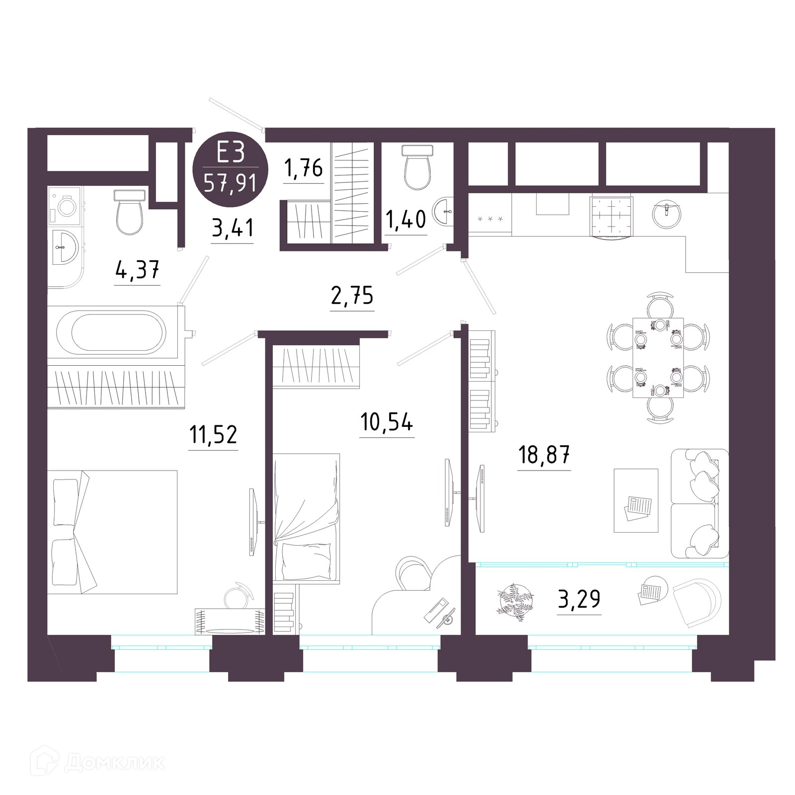 Планировка 2 комн. в ЖК Крылья