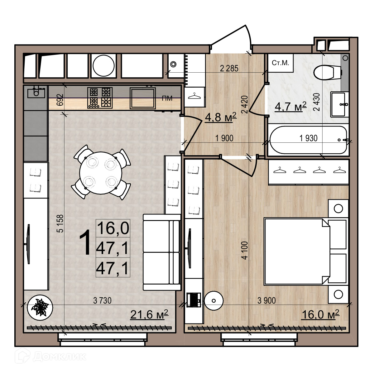 - Общая площадь: 47.1 м²
