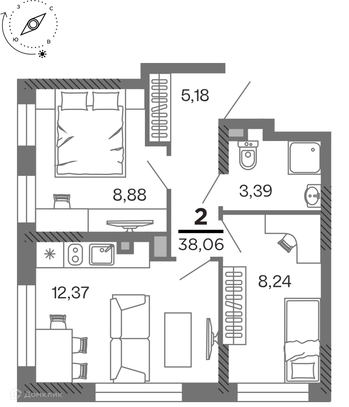 - Общая площадь: 38.06 м²