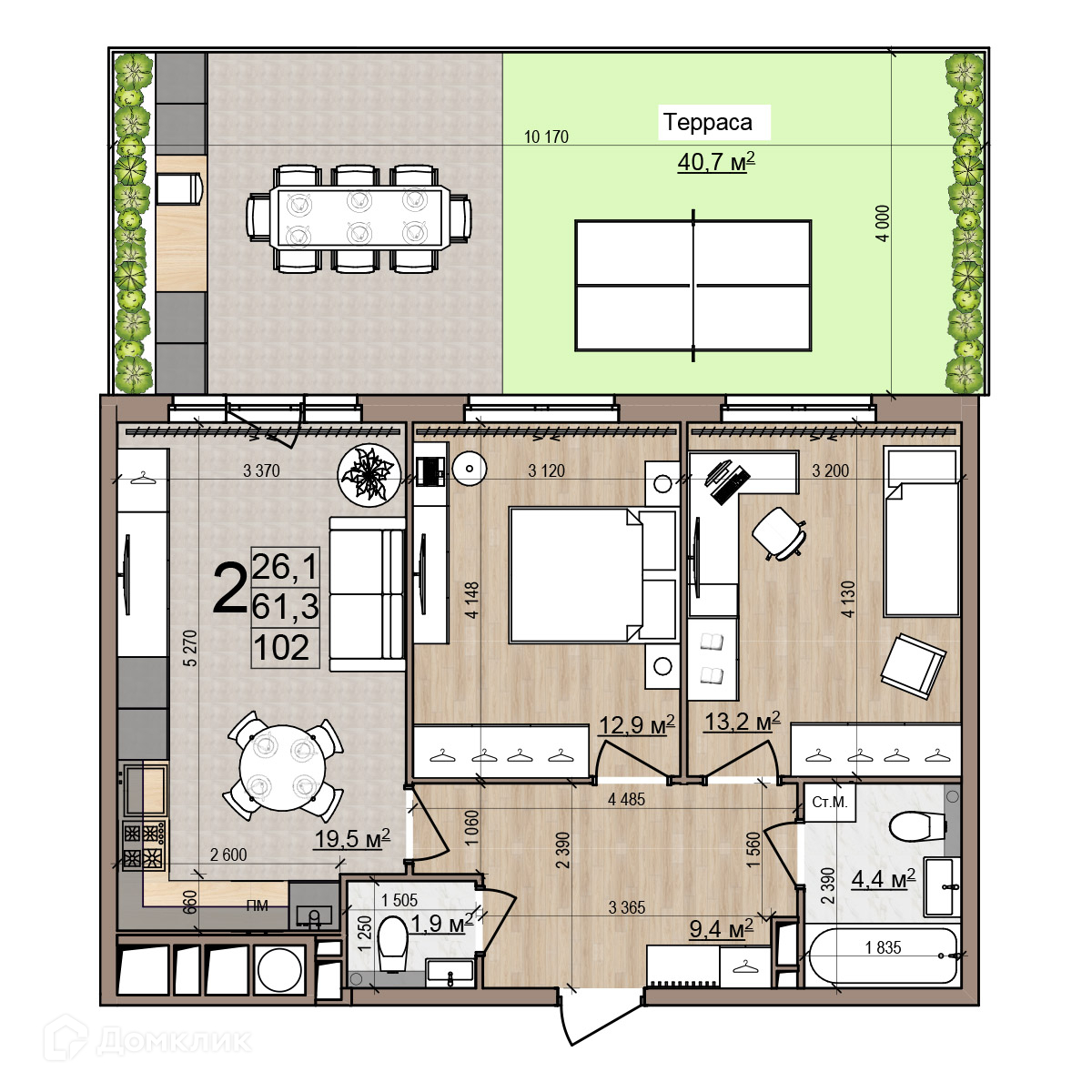 - ✅ Общая площадь: 102 м².
