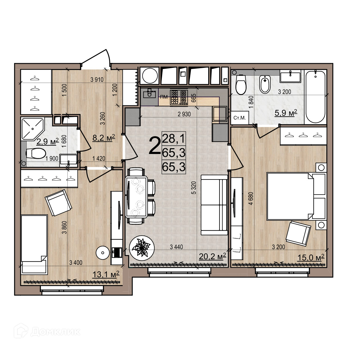 - ✅ Кухня: 20.2 м² — эргономичное пространство.