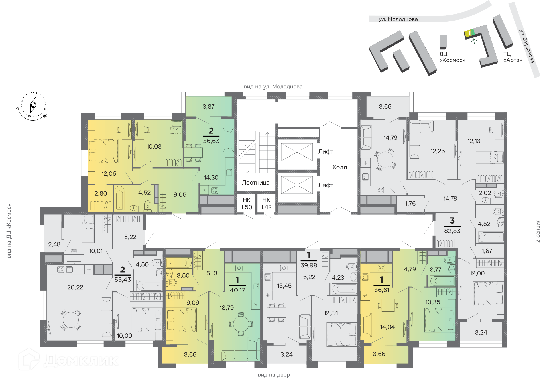 - Общая площадь: 55.43 м²