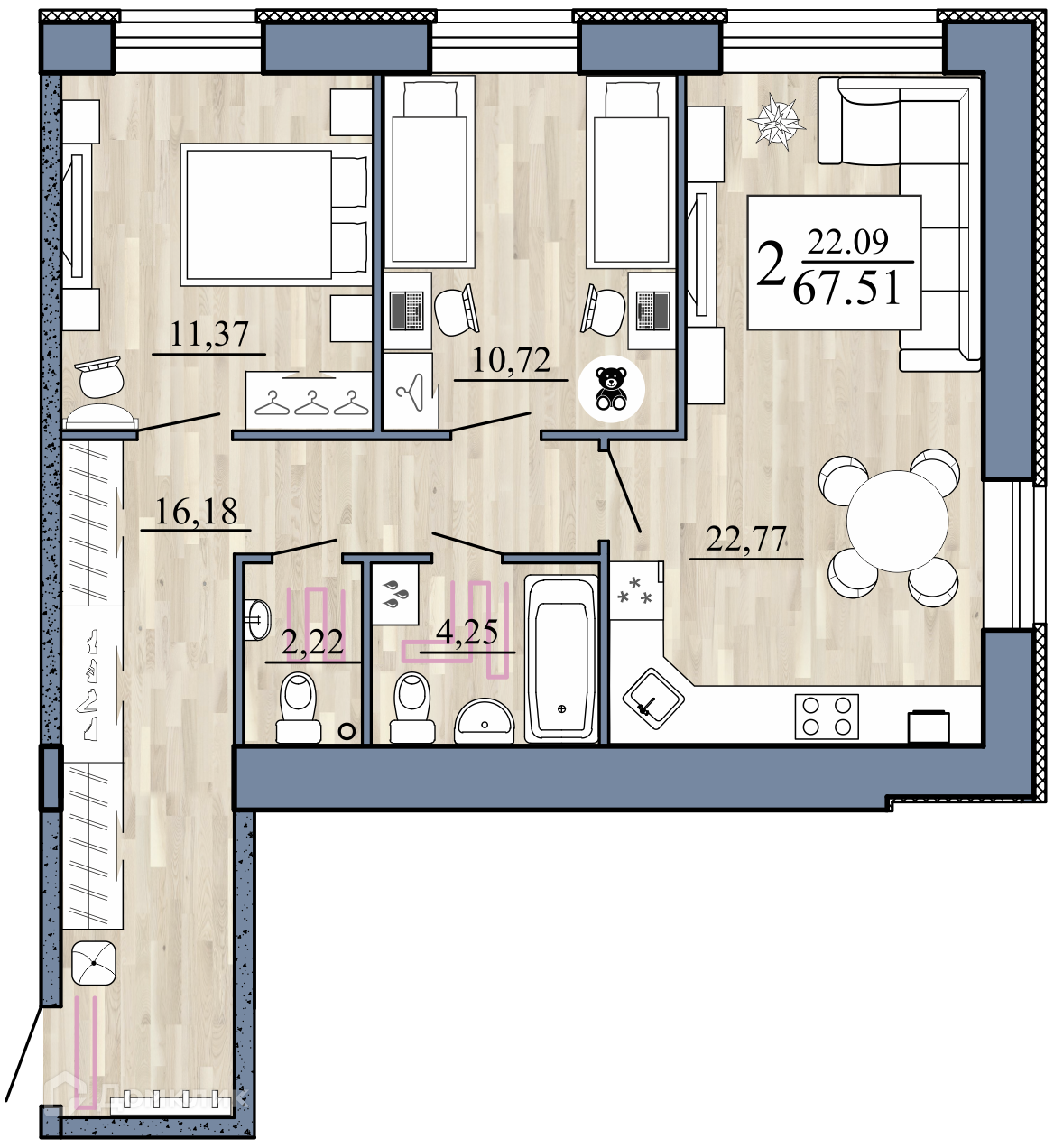 - ✅ Кухня: 22.77 м² — идеальна для семейных ужинов.