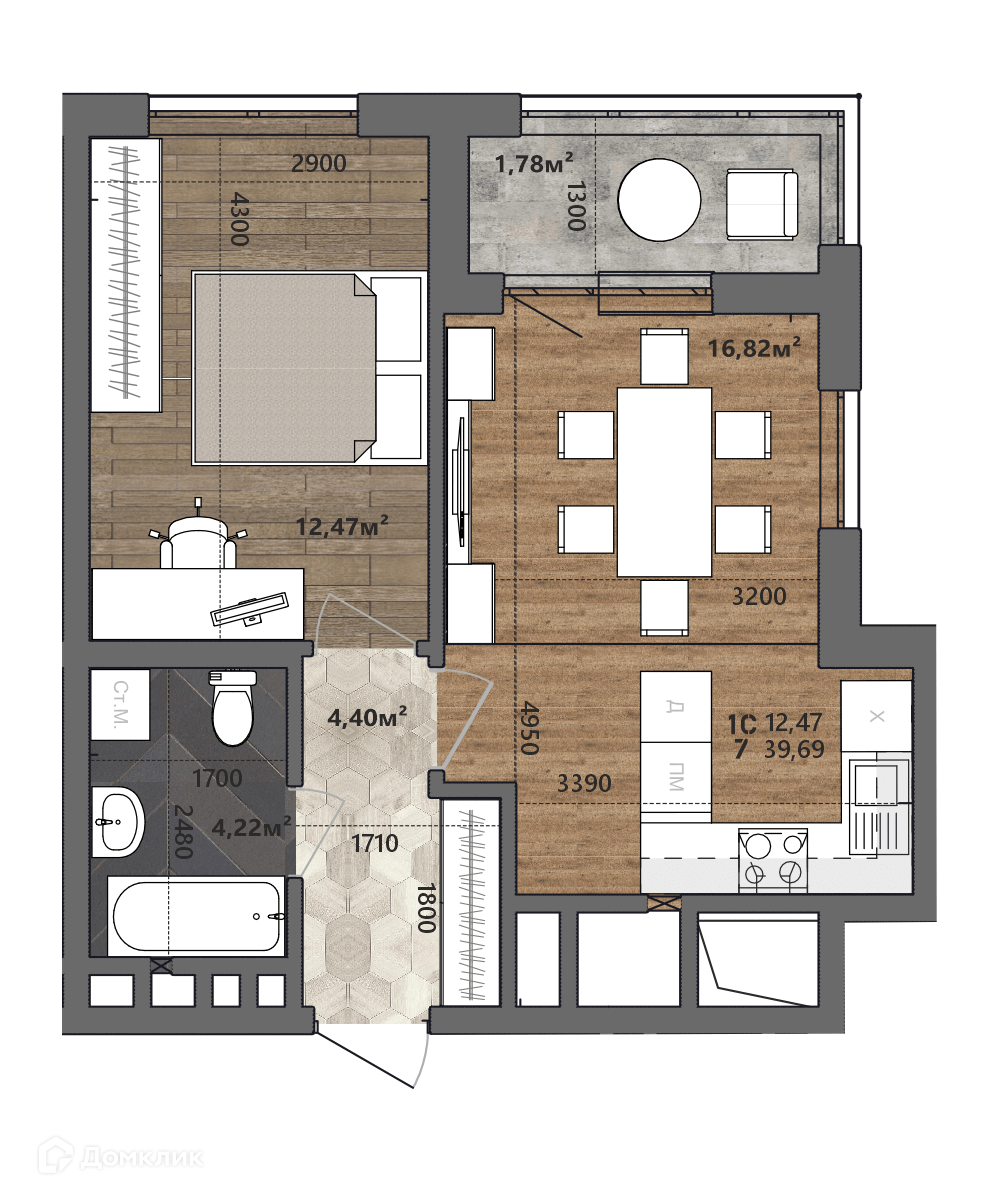 - Общая площадь: 39.69 м²