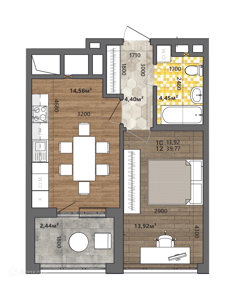 - ✅ Общая площадь: 39.77 м².