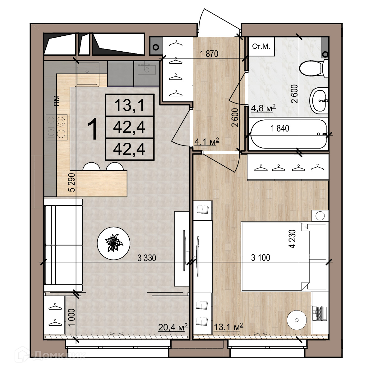 - Общая площадь: 42.4 м²