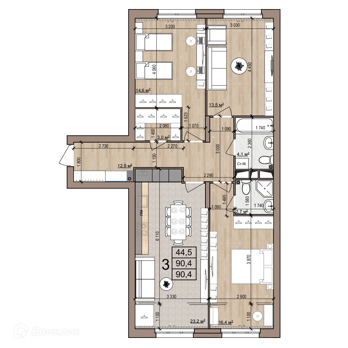 - ✅ Кухня: 23.2 м² — эргономичное пространство.