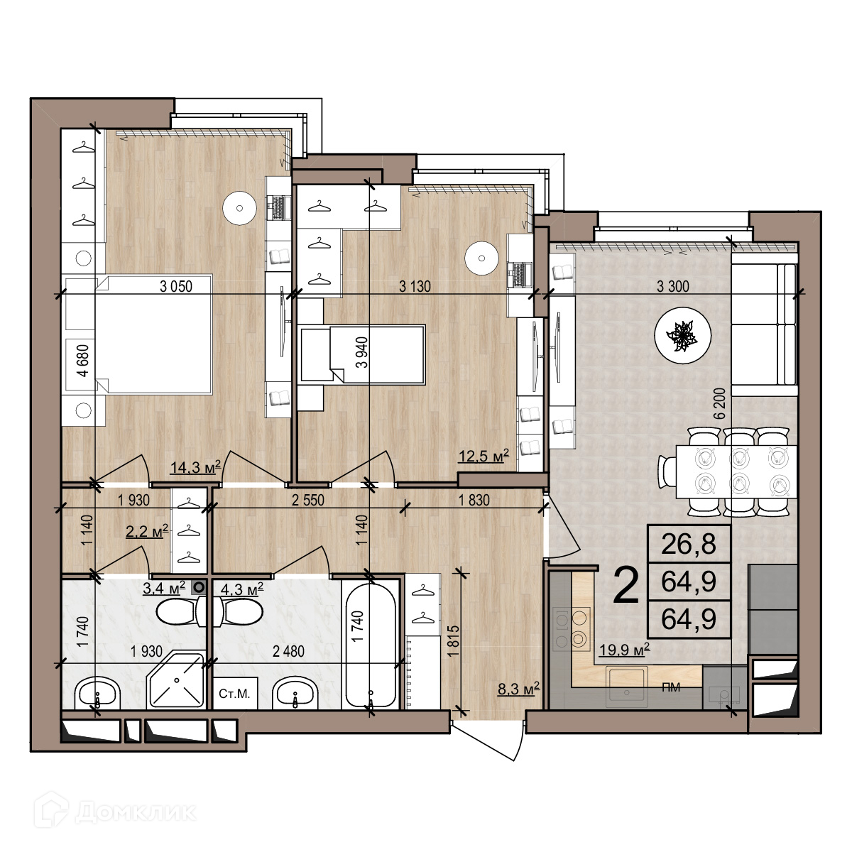 - Общая площадь: 64.9 м²