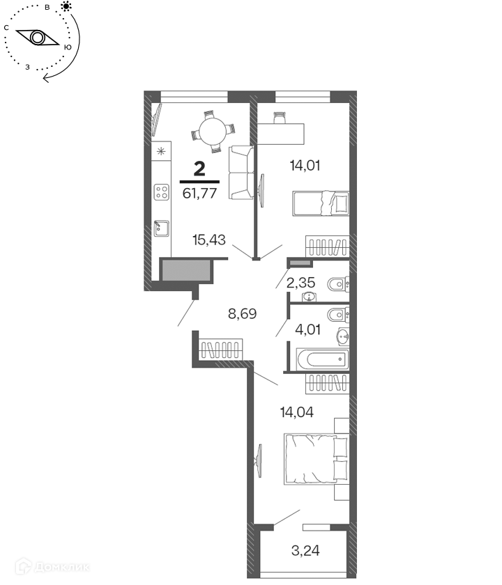 - Общая площадь: 61.77 м²