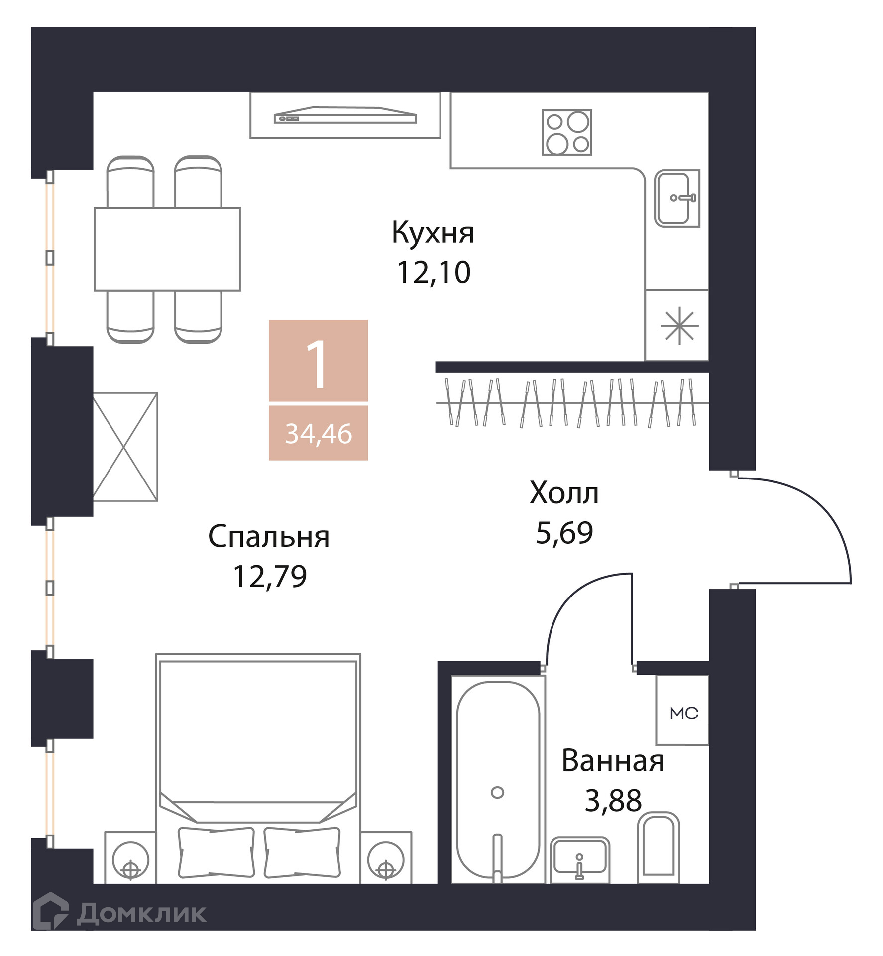 - ✅ Просторная жилая площадь: 12.79 м².