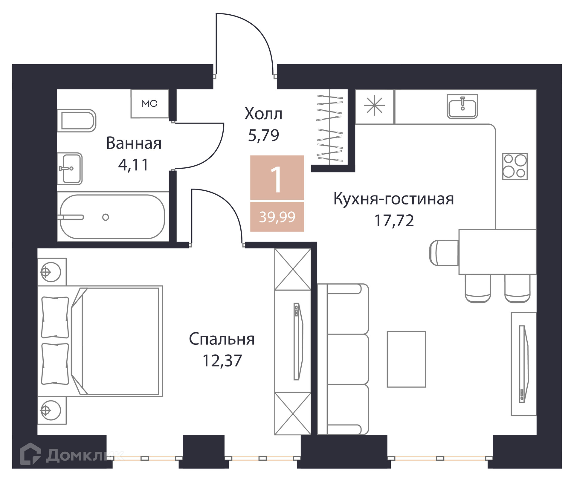 - Общая площадь: 39.99 м²