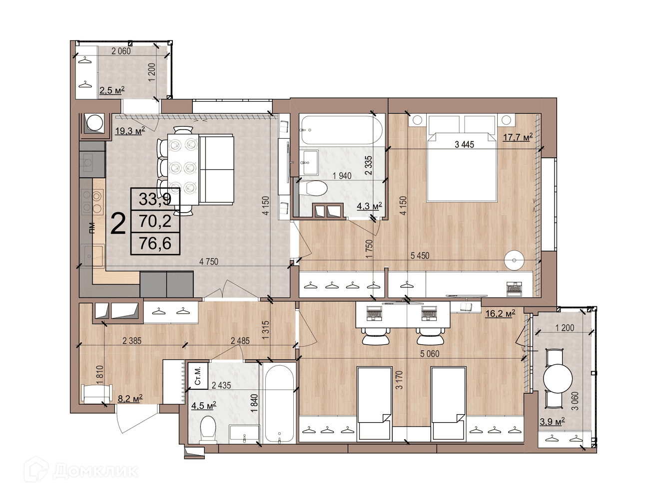 - ✅ Кухня: 19.3 м² — идеальна для семейных ужинов.