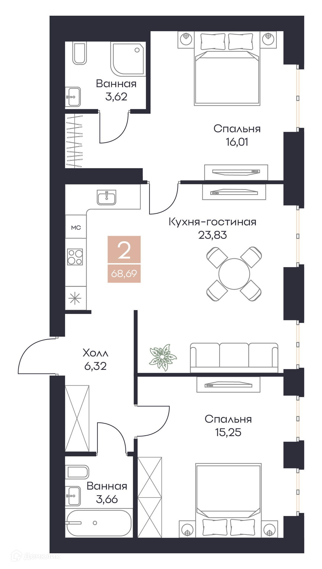- Общая площадь: 68.69 м²