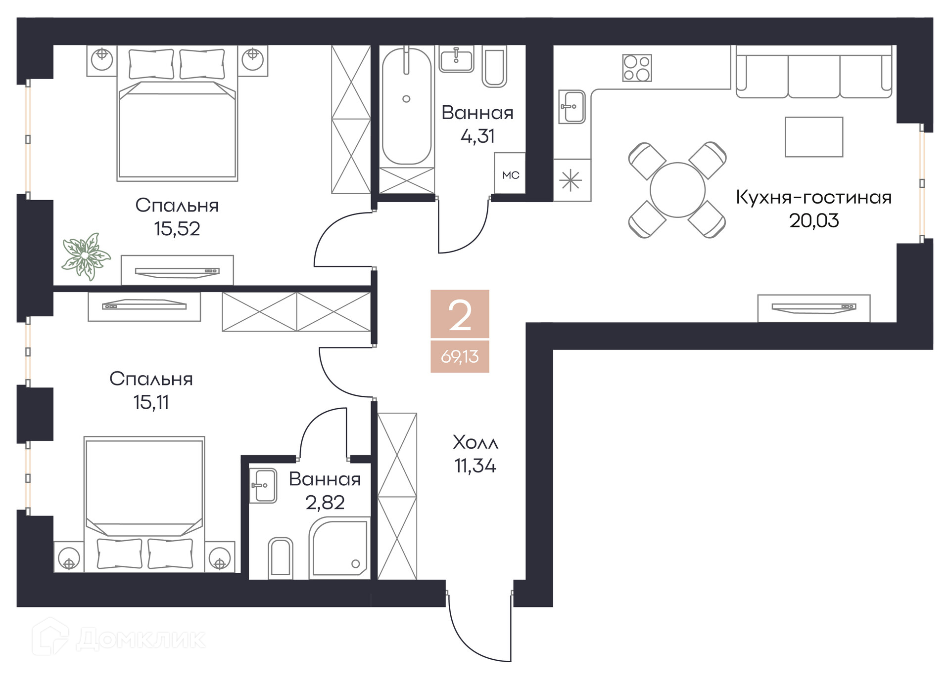 - ✅ Кухня: 20.03 м² — идеальна для семейных ужинов.