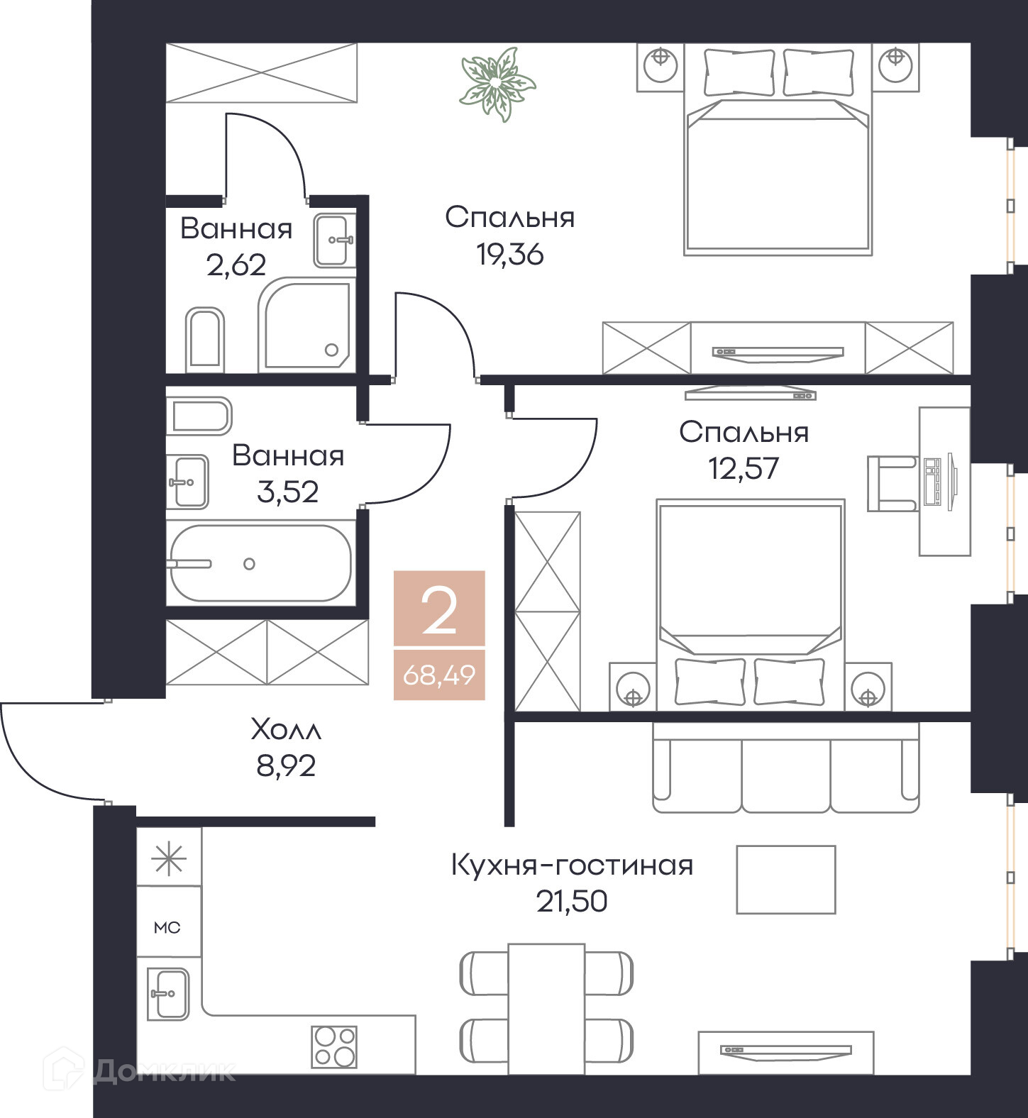 - Общая площадь: 68.49 м²