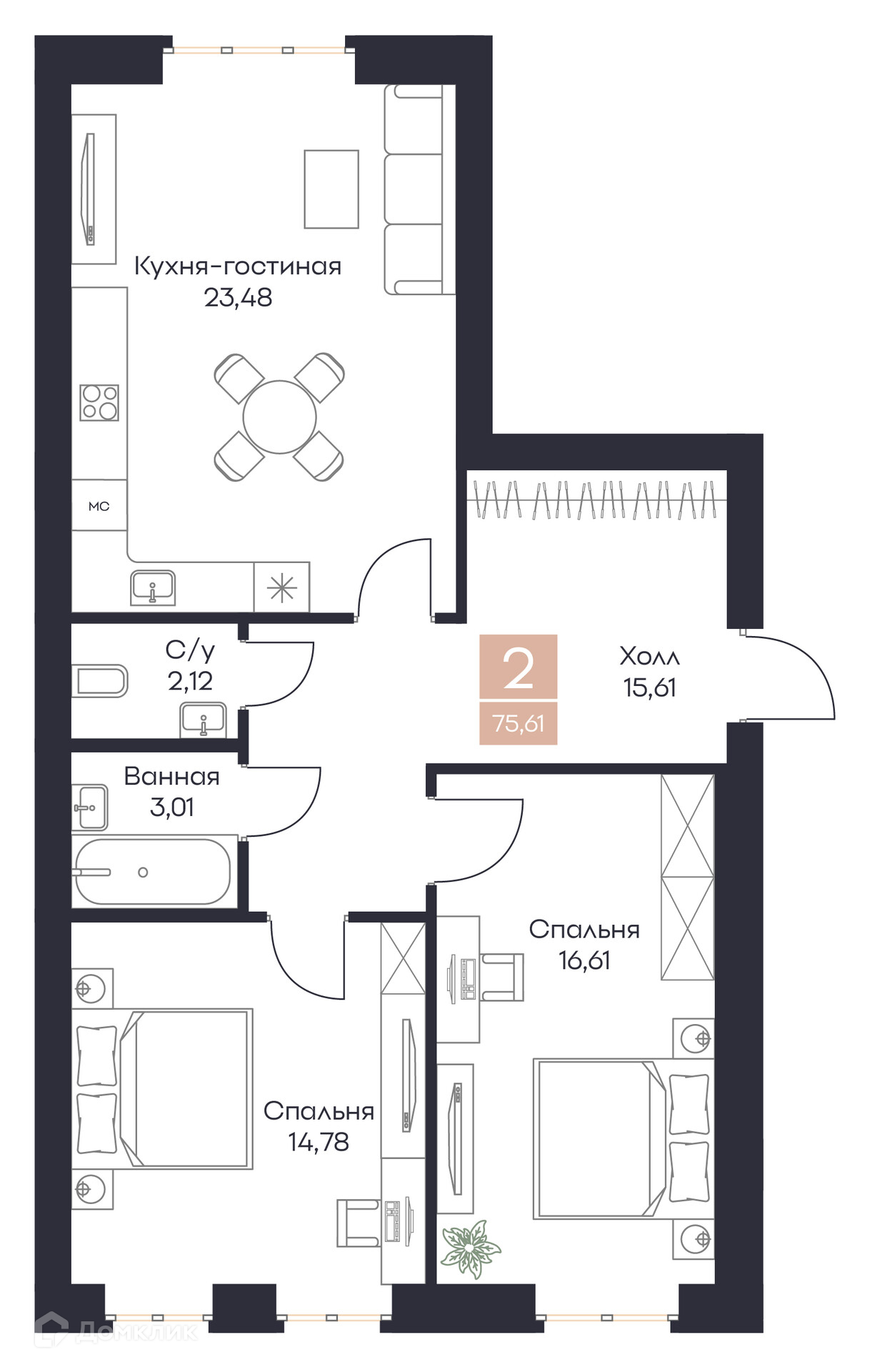 - Общая площадь: 75.61 м²