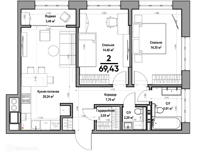 Планировка 2 комн. в ЖК Аструм