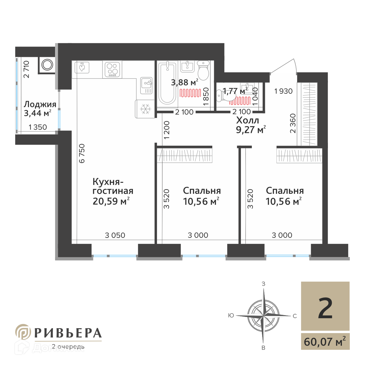Продается 2-комнатная квартира в новом жилом комплексе "ЖК Ривьера 2" 🏢. Квартира расположена на 2-м этаже 10-этажного дома. Отличный вариант для инвестиций.